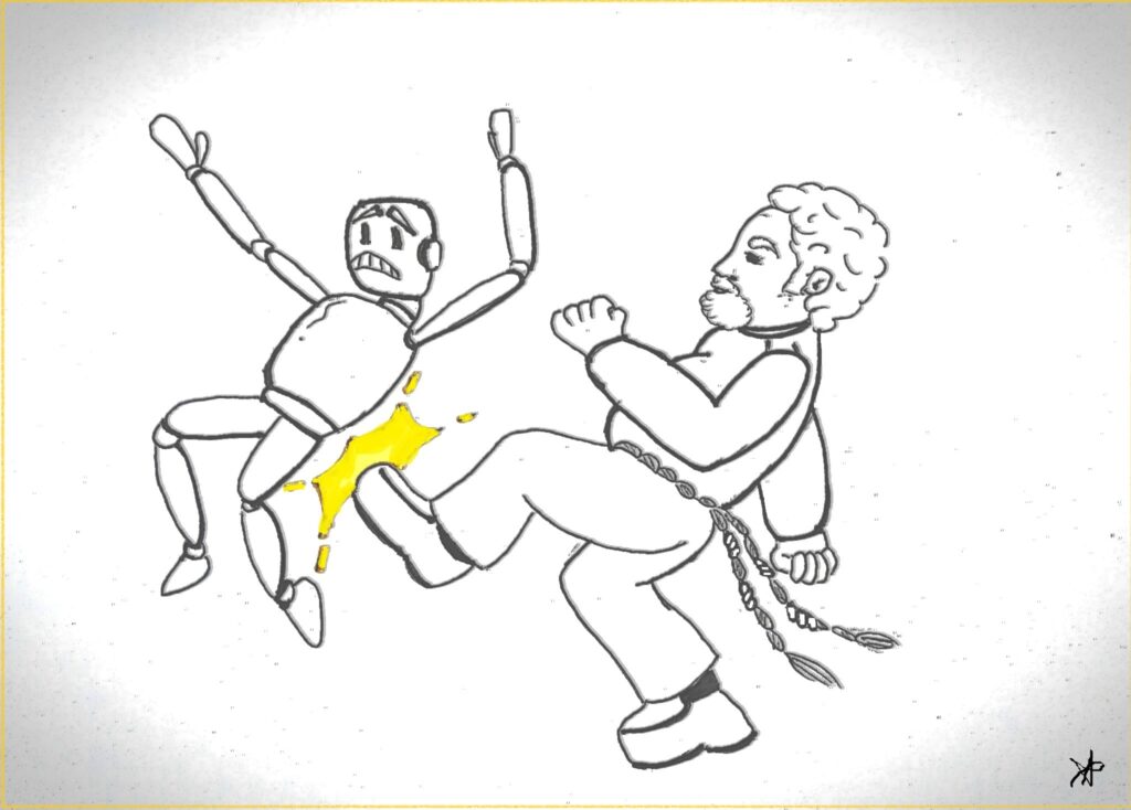 Rimuginava in silenzio, il padrone di casa, tra dubbi e certezze, ascoltando l’amico funzionario-tecnico. Ma quando quest’ultimo asserì che il Robot del costo di un miliardo e mezzo (in fabbrica ne possedevano sei) rappresentava per l’industria, oltre che uno snellimento di lavoro, anche una questione “d’immagine”, Luca, che intanto aveva calcolato con la velocità della luce che quell’ “immagine” aveva azzerato il salario di cinquanta operai per dieci anni circa, scoppiò dicendo:< ma quando ti passano davanti questi robot,… glielo dai un calcio?>