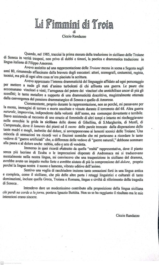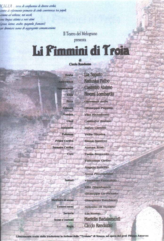 Cari amici, vi scrivo ancora di teatro e del mio appassionato lavoro di trasposizione in lingua siciliana delle tre opere di cui sopra, la prima delle quali è stata rappresentata con successo al castello di Carini nel 2002, con un eccezionale cast artistico e tecnico che vi presento, di seguito, in locandina.