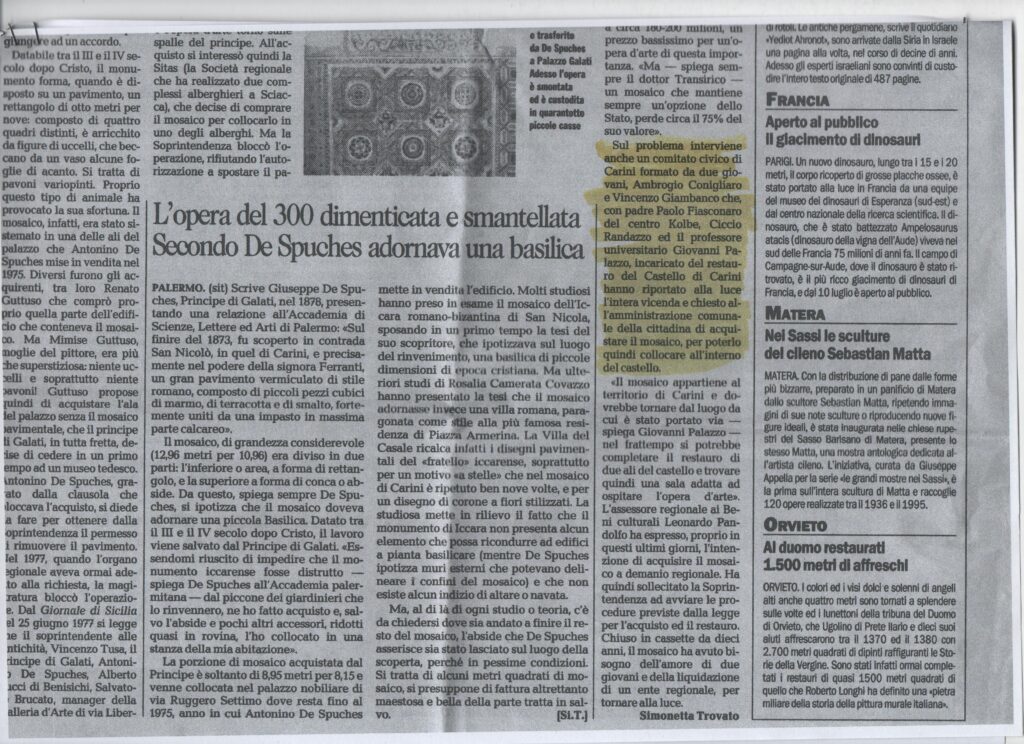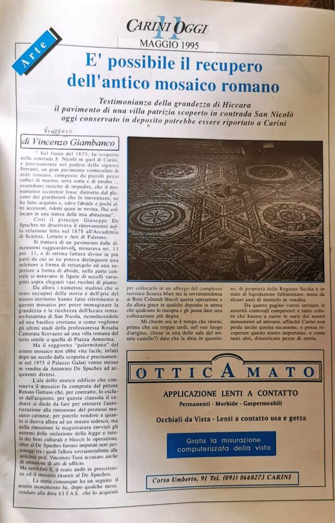 (1) Il mosaico romano era stato scoperto alla fine del XIX secolo in contrada San Nicola, sito della Hiccara romano-bizantina. Il manufatto fu acquistato dal P.pe De Spuches che se ne abbellì un salone del suo palazzo palermitano.In seguito il Palazzo fu acquistato dal pittore Renato Guttuso e la moglie di questi non volle il mosaico in casa. Il prezioso manufatto fu smontato e dopo varie peripezie anche legali, fu immagazzinato e per venti anni circa non si ebbero più notizie del prezioso mosaico. Vincenzo Giambanco junior ed Ambrogio Conigliaro futuri soci di Archeoclub, impegnando tanto tempo ed utilizzando il loro “fiuto” di esperti ricercatori, su indicazione del portiere, trovarono il mosaico in un deposito dello stesso palazzo De Spuches. Nacque un comitato spontaneo pro-mosaico con la collaborazione attiva del Prof. Giovanni Palazzo, di Padre Paolo Fiasconaro, del Sig. Ciccio Randazzo, e dei giovani sopracitati Vincenzo Giambanco ed Ambrogio Conigliaro che si occupò di segnalare agli organi competenti il ritrovamento. Si arrivò così con buona solerzia dei responsabili della Soprintendenza e della Regione Siciliana all’acquisto del mosaico, perché risultava ancora di proprietà privata. Il manufatto venne restaurato ed ora si spera che possa ritornare a Carini. Per questo evento, l’amministrazione La Fata e la Curia Arcivescovile di Monreale hanno messo a disposizione il supporto economico e logistico, e i locali della Chiesa del Carmine.
